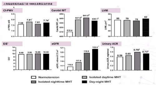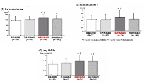 上海瑞金醫(yī)院對(duì)高血壓門診1808名未接受降壓治療患者進(jìn)行研究,對(duì)不同隱蔽性高血壓亞型進(jìn)行探索,結(jié)果發(fā)現(xiàn),無論是何種隱蔽性高血壓患者(白天血壓增高、夜間血壓增高、白天和夜間血壓均增高)都會(huì)出現(xiàn)不同程度的腎臟、血管等靶器官損傷(圖2)。